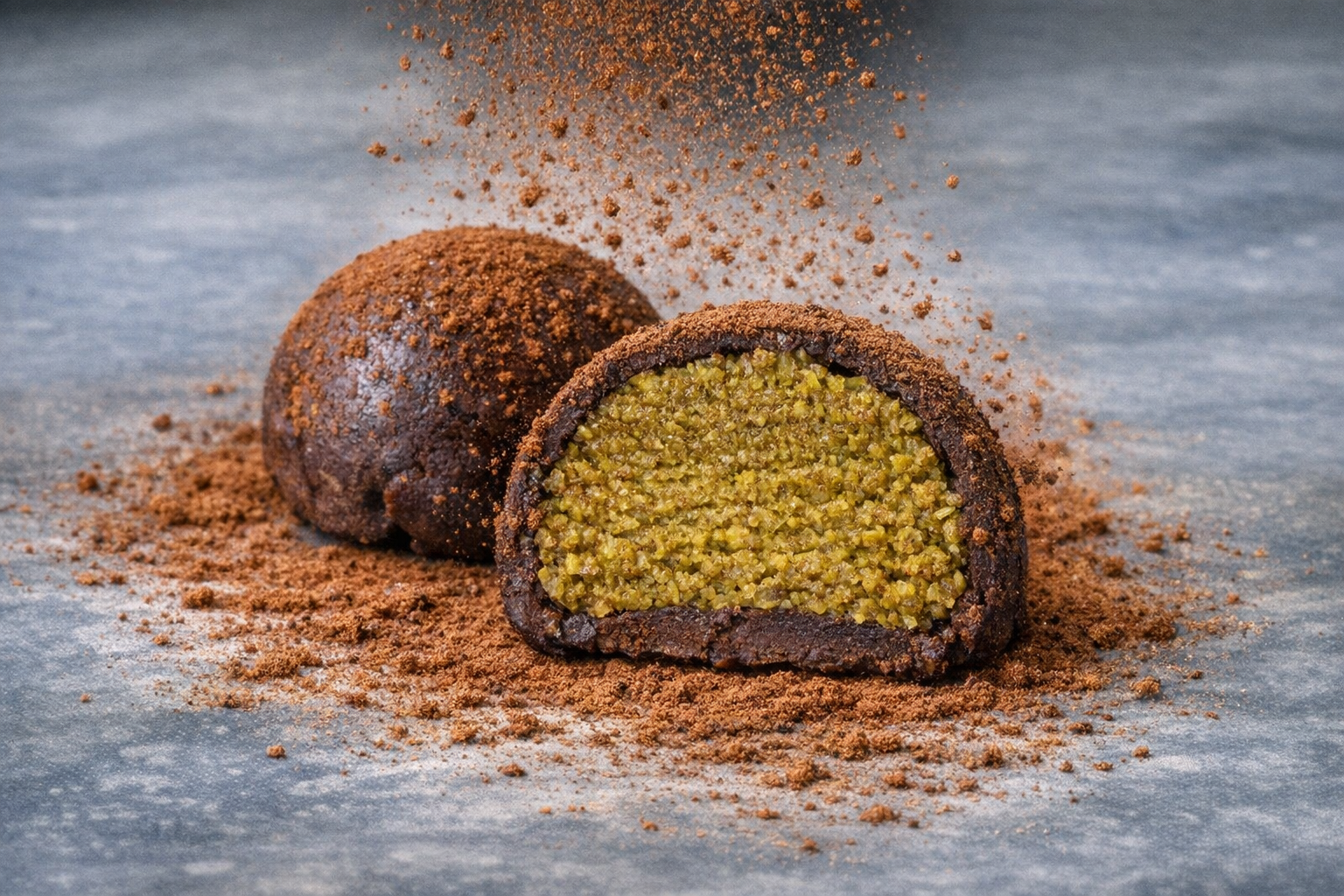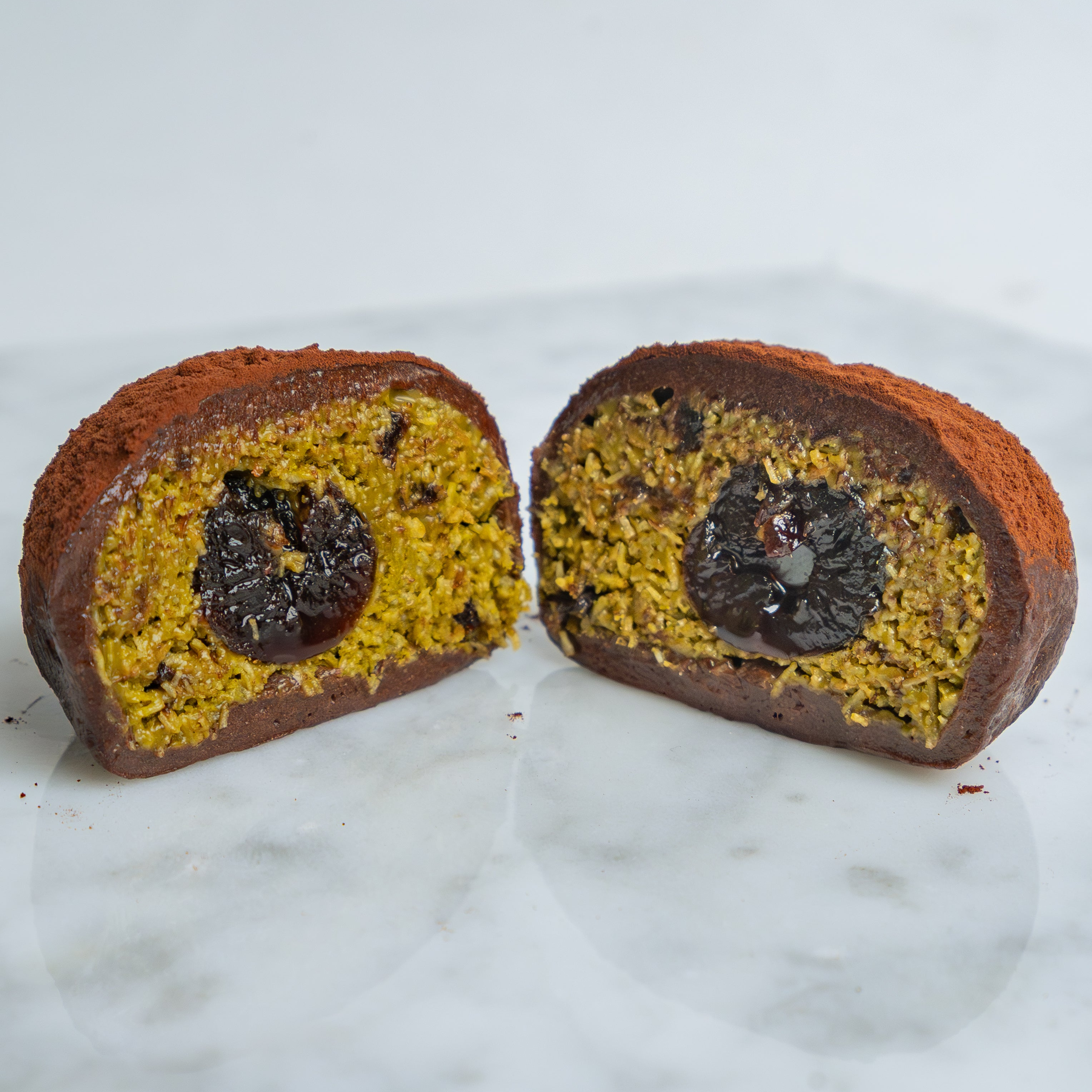 Eine Kakaomarshmallow-Hülle, ein cremiger Pistazien-Weiße Schokolade Kern und ein Hauch knuspriges Kataifi machen ihn sofort erkennbar - und äußerst teilenswert.