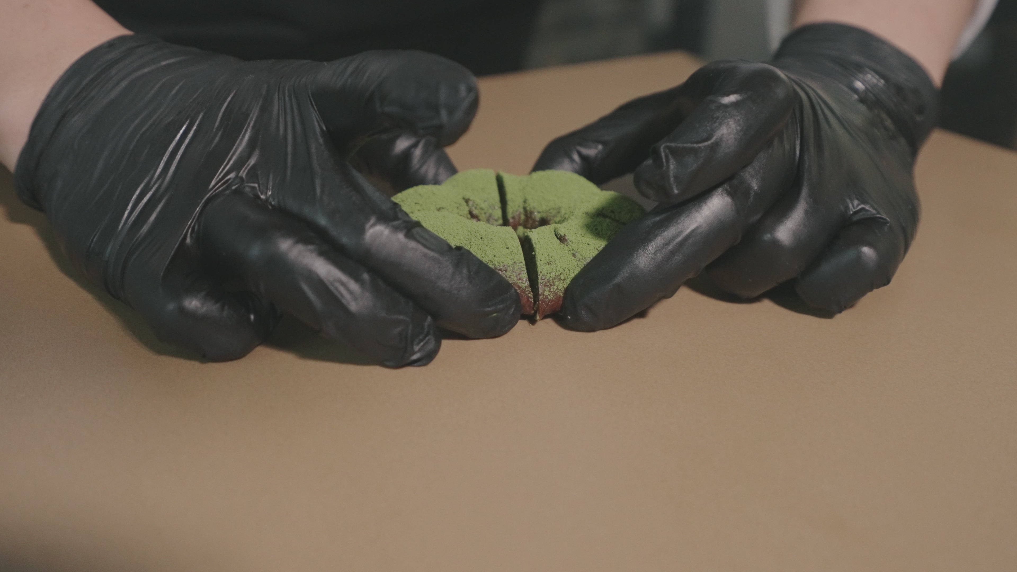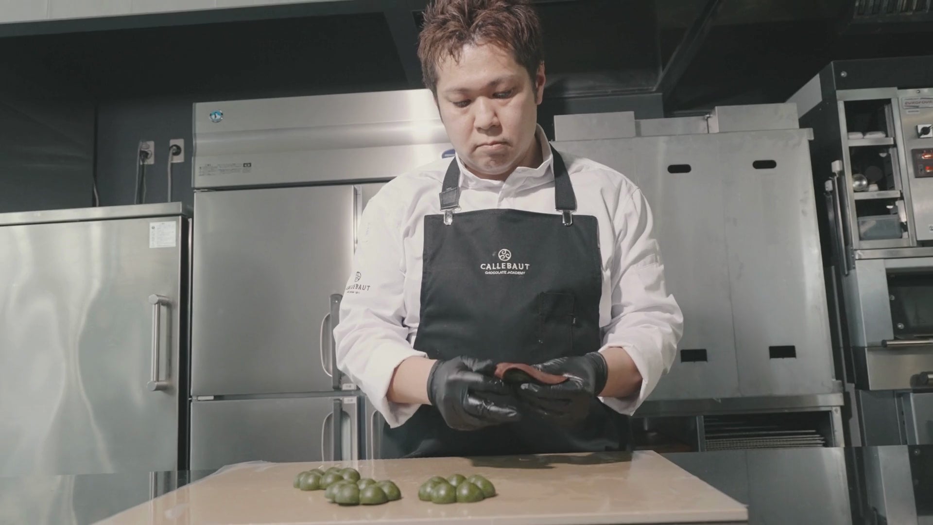 Die Füllung besteht aus einer Kombination aus Pistazienpaste, Callebaut Weiße Schokolade Rezept Nr. W2, knusprig buttergeröstetem Kadaifi, Huiletine und Zitronenconfit - all das ergibt einen intensiven ‚Dubai-Bar-Style‘-Kern. Das feine Vanillearoma und der ausgewogene Geschmack der W2 harmonieren perfekt mit Pistazien und Kadaifi. Die Marshmallows, die die Füllung umhüllen, sind großzügig mit Kakao verfeinert und mit Matcha bestäubt - eine Balance aus süßen und leicht herben Noten - und überzeugen mit einer wunderbar zähen Textur, die sich perfekt mit dem luxuriösen Inneren verbindet.