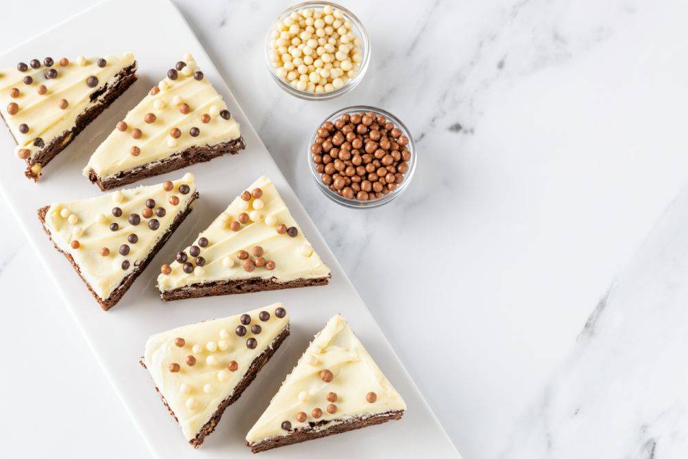| 5 | Mit weißen, dunklen und Milchschokoladen‑Crispearls dekorieren. |
